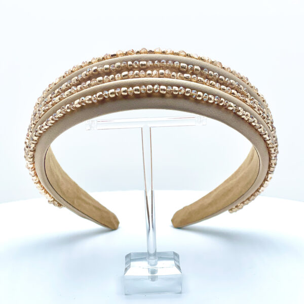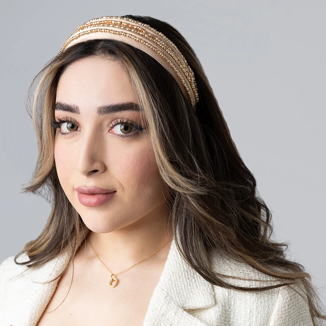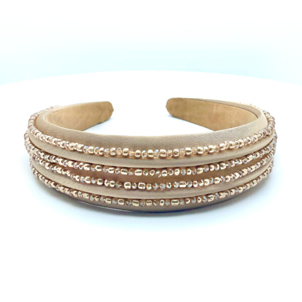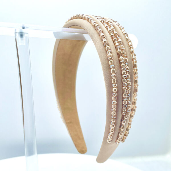 Der ABAN Haarreif kombiniert schlichte Eleganz mit angenehmem Tragekomfort. Die breite Form sorgt für einen modernen Look, während vier Reihen fein schimmernder Glasperlen dezent für einen Hauch von Glanz sorgen – ganz ohne Übertreibung.