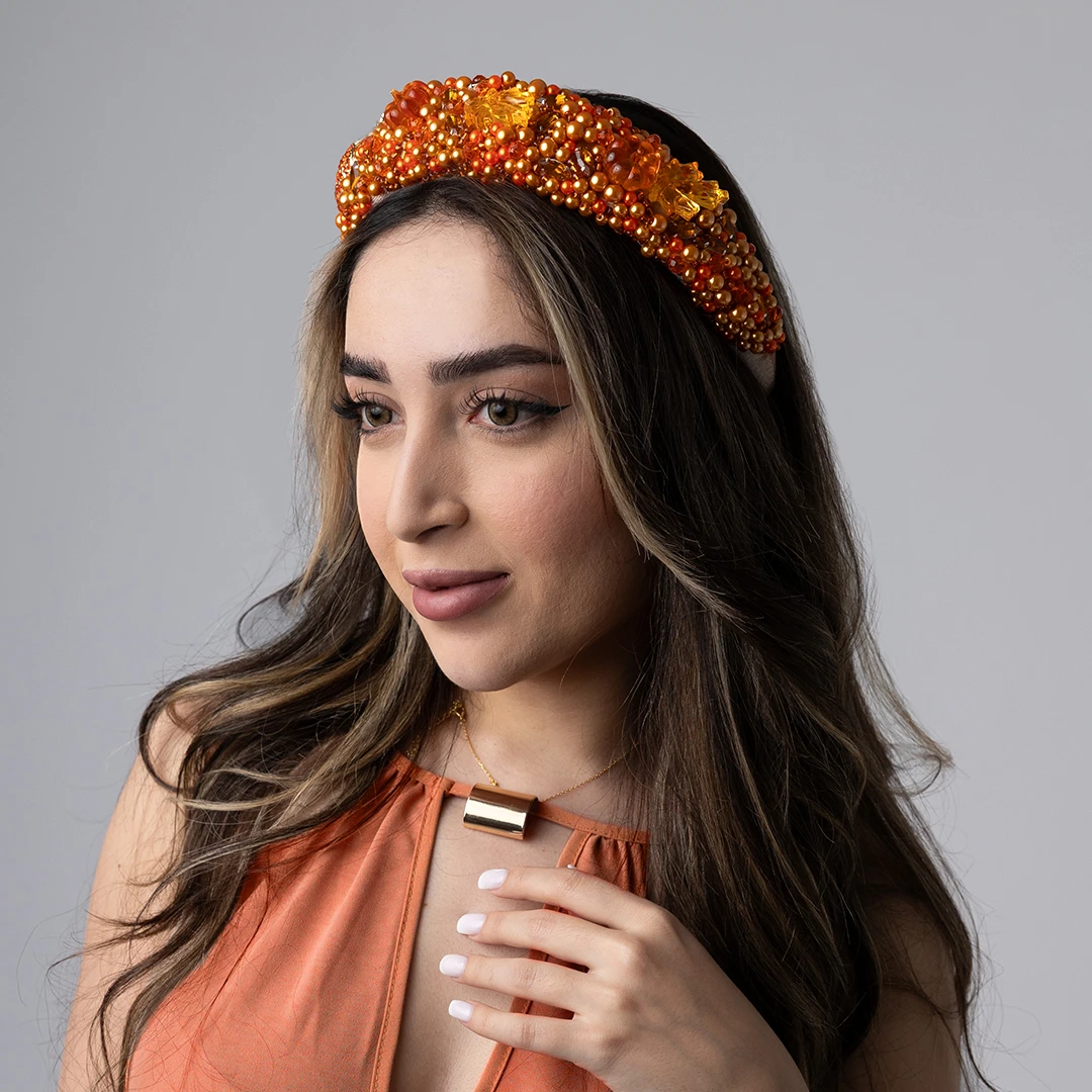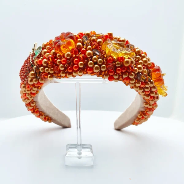 AUTUMN CROWN ist ein echter Hingucker für alle Herbstliebhaberinnen. Der hoch gepolsterte Haarreif ist mit orangen Perlen, funkelnden Kristallen, künstlichen Herbstblättern und einem markanten Metall-Kürbis auf einer Seite verziert.