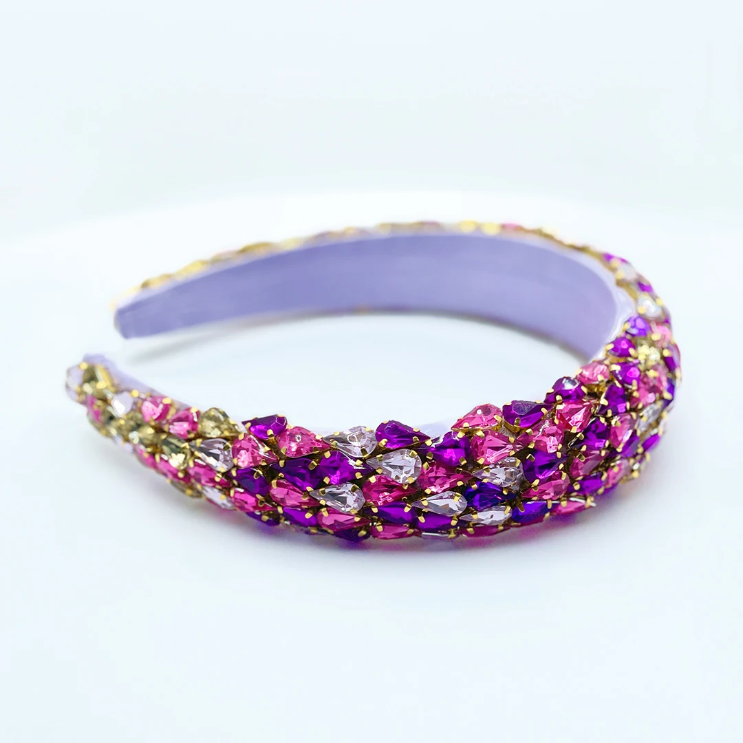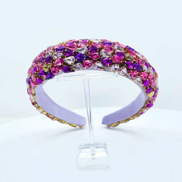 💜 Zart, feminin und ein echter Blickfang: NILA ist ein gepolsterter Haarreifen aus helllila Stoff, liebevoll von Hand verziert mit schimmernden Strasssteinen in Rosa, Flieder und dunklem Violett.