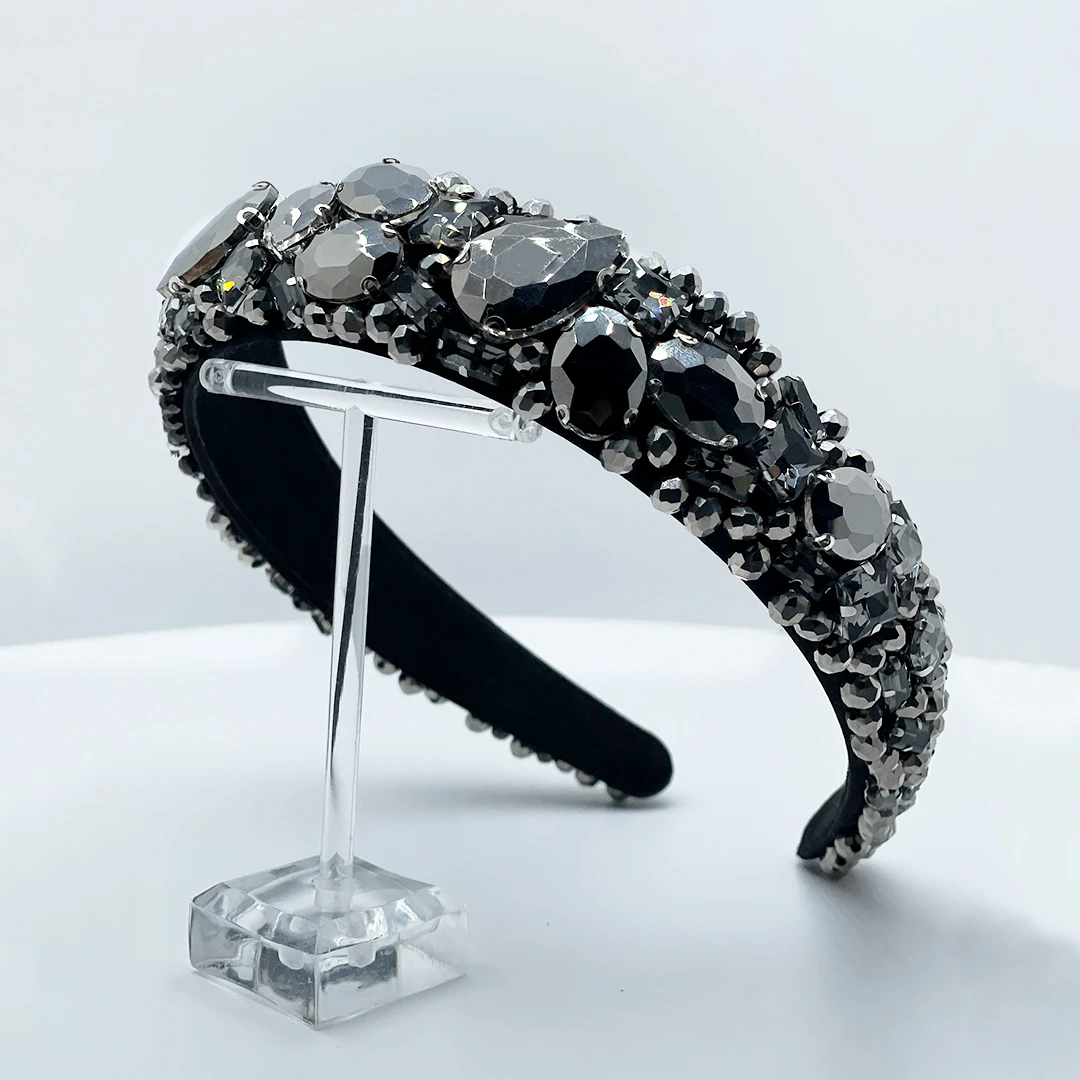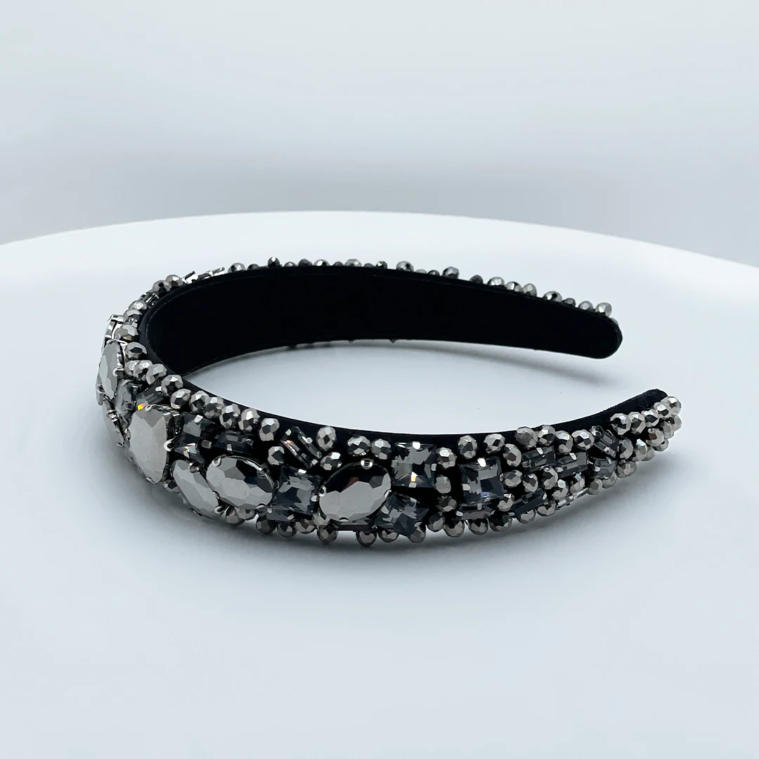 Der PERANSA Haarreif verleiht jedem Look eine edle Note – mit einem leicht gepolsterten schwarzen Stoff und einer aufwendigen Bestickung aus silber-grauen Kristallperlen sowie auffälligen Strasssteinen. Die funkelnden Details reflektieren das Licht eindrucksvoll und machen PERANSA zu einem echten Blickfang.